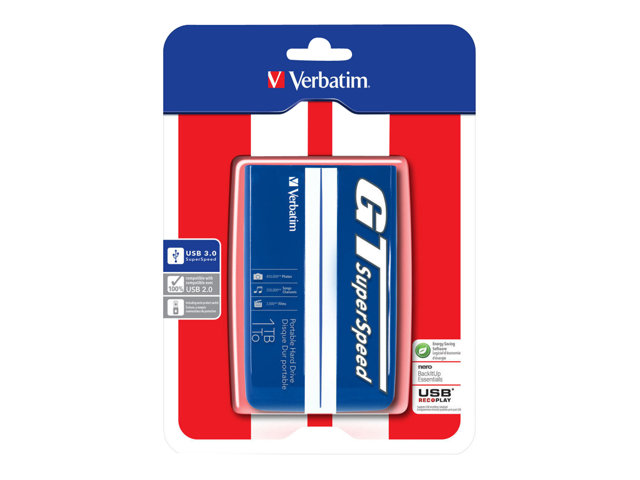 Verbatim GT SuperSpeed - Disque dur - 1 To - externe (portable) - 2.5" - USB 3.0 - blleu avec des bandes blanches